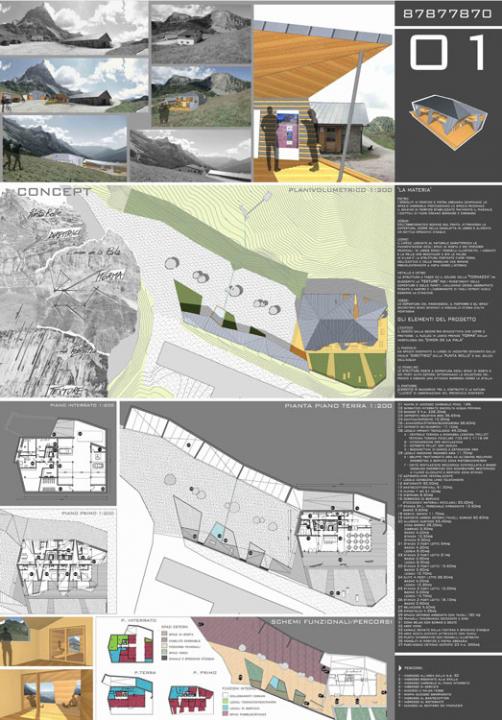 È un edifico che denuncia una forza tipica degli elementi della montagna fortemente ancorati al suolo, che tenta di trasformare un indefinito sito in un “luogo” esprimendosi attraverso il linguaggio della contemporaneità.