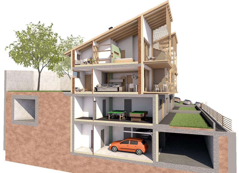 L’andamento del terreno se da un lato, a fronte delle scelte insediative operate, preclude la possibilità di fruire di un giardino privato direttamente dalla zona giorno, dall’altro determina la creazione di un prezioso livello seminterrato, ovvero completamente interrato verso monte e completamente aperto verso valle; gli spazi che qui si creano vengono proposti come superfici moltifunzionali, aggiuntive rispetto a quella delle abitazioni e il cui utilizzo è del tutto personalizzabile in relazione alle specifiche esigenze dei soci prenotatari (studio, palestra, sala giochi, lavanderia, taverna, dependance, ecc). Si tratta quindi di spazi “nobili” il cui impiego viene ulteriormente valorizzato nella bella stagione dalla presenza del verde privato con il quale instaurano uno stretto legame funzionale.